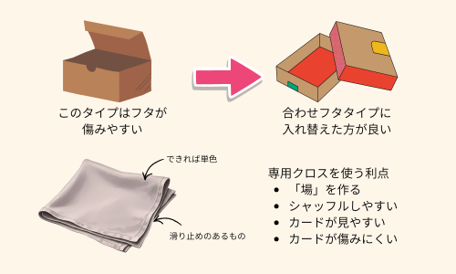 これは、占いという非日常の場を作るためであると同時に、シャッフルしやすい、スプレッドしたカードが見やすい、カードが傷まない、などという実用的な理由があります。