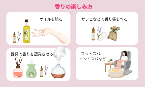 また、アロマデュフーザー、アロマランプで香りを楽しむ方法もあります。器具に使い方が載っているはずなので、必ず使用方法を守りましょう。